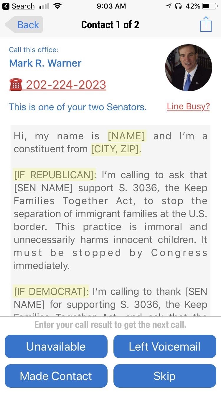 Click on one of the representatives for the phone number as well as a script if you need a starting point. Here’s what will happen: you call, a staffer answers, you read your script, the staffer asks for your name and address/zip (to verify you are a constituent), staffer assures you they will pass along your message, you thank them for their time. Done!