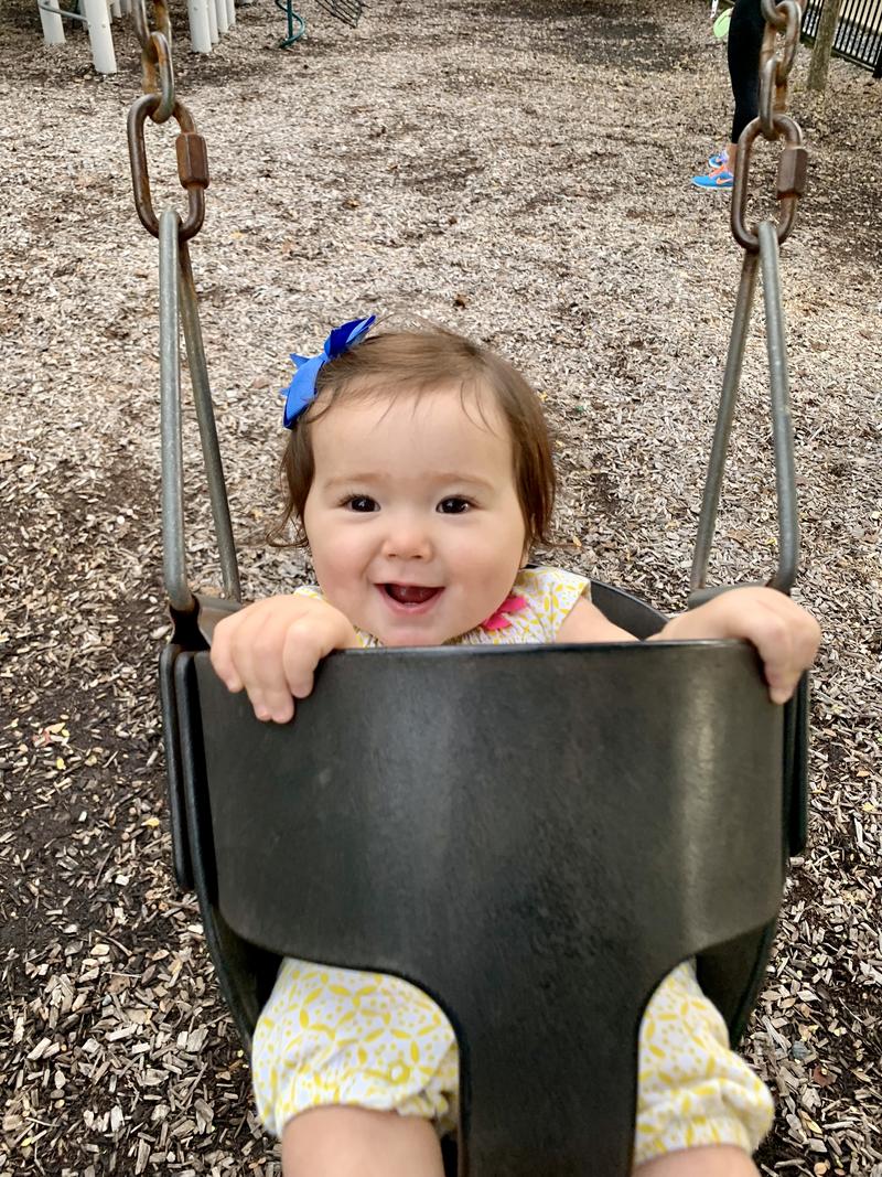 Zoe loves to stand but she still hasn’t figured out how to take a step forward. We have tried pretty hard to get her to walk with the Y bike, but to no avail. On a good day she will take one or two cautious steps forward then sit back down. But she isn’t always that cautious; she will hurl herself happily down any slide without hesitation. She even learned to say “go”, which sounds more like “ga”, when she wants to go down. It’s the cutest thing. She is happiest when she is hanging upside down. She loves being picked up by her legs and flipped. I think we are going to have a little gymnast (unless she gets Aaron’s flexibility (i.e. hasn’t touched his toes since he was in grade school)).