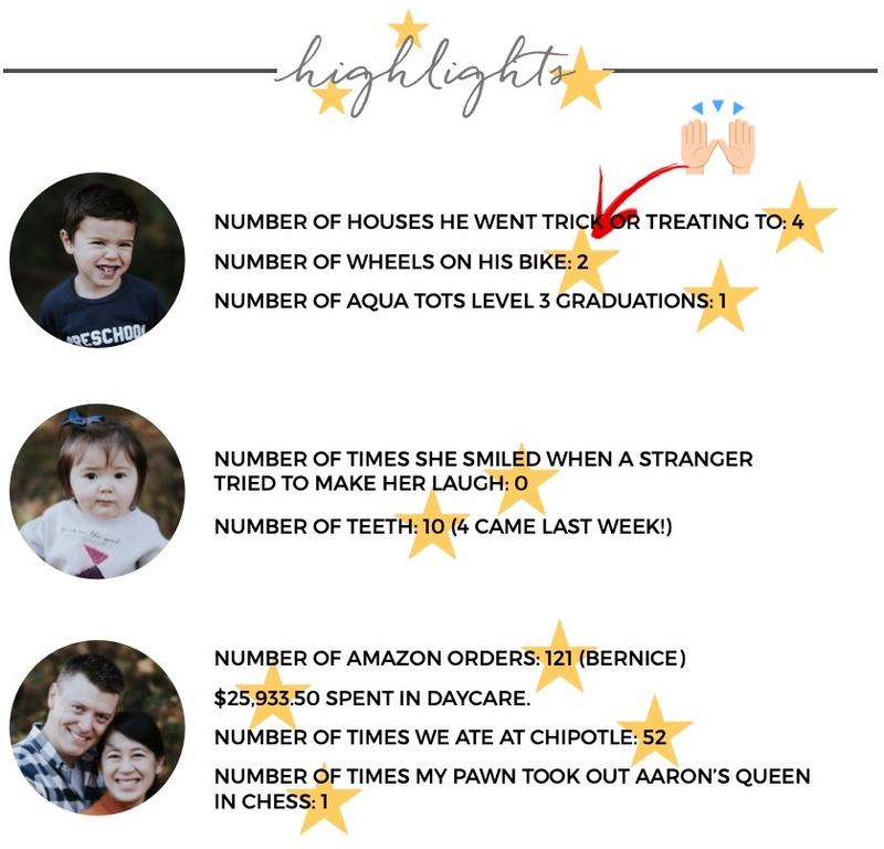 In summary, Aaron and I eat at Chipotle way too often and we are both terrible at chess. Despite the number of Amazon orders made, I returned 27 items! Amazon, please don’t ban me (have you seen this article)! Max had a big year learning to swim and ride his bike. On the other hand, Zoe set the bar low with her “highlights”, so we are expecting big things from her in 2019.