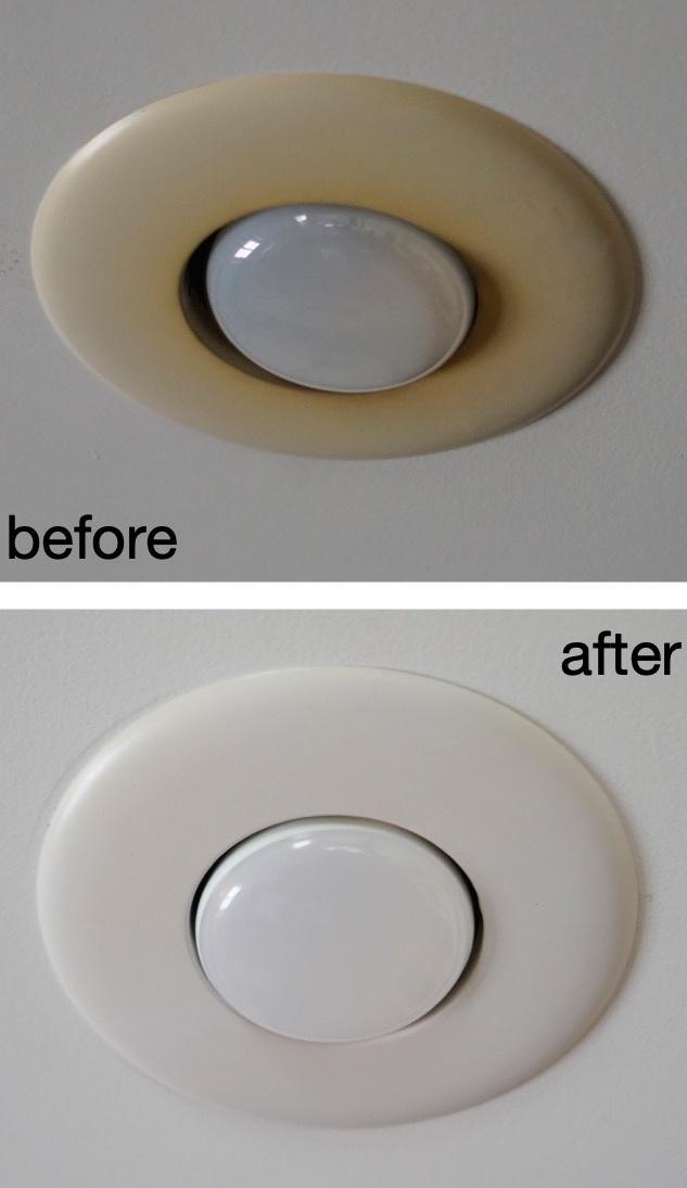 We had a bunch of recessed lighting plates that had been discolored. To replace one cost $8. With 18 lights that was going not happen. Instead, a little sanding and a few coats of spray paint and they look good as new. I’m thrilled how well these turned out and they were so easy!