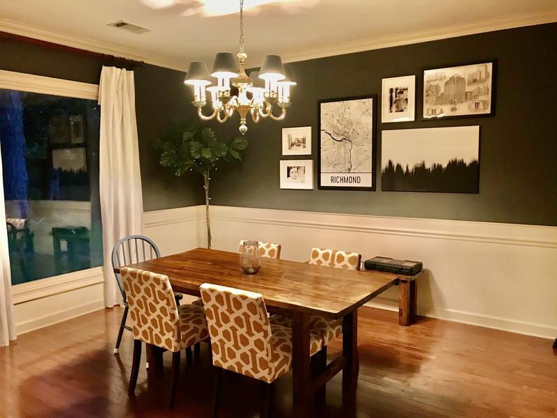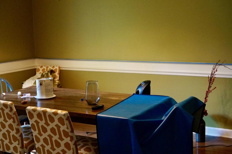 After finally dealing with our leaking roof, broken AC unit, and maggots in our trash can (yes, so gross!), we finally had time to tackle some fun home updates. For Aaron, this meant swapping out outlets/light switches for smarter alternatives. For me, this meant tackling our pickle green dining room. Unfortunately, I was so eager to start painting that I forgot to take before pictures. A few hours into the project I snapped a few pics, but it doesn’t quite capture the room as it was.